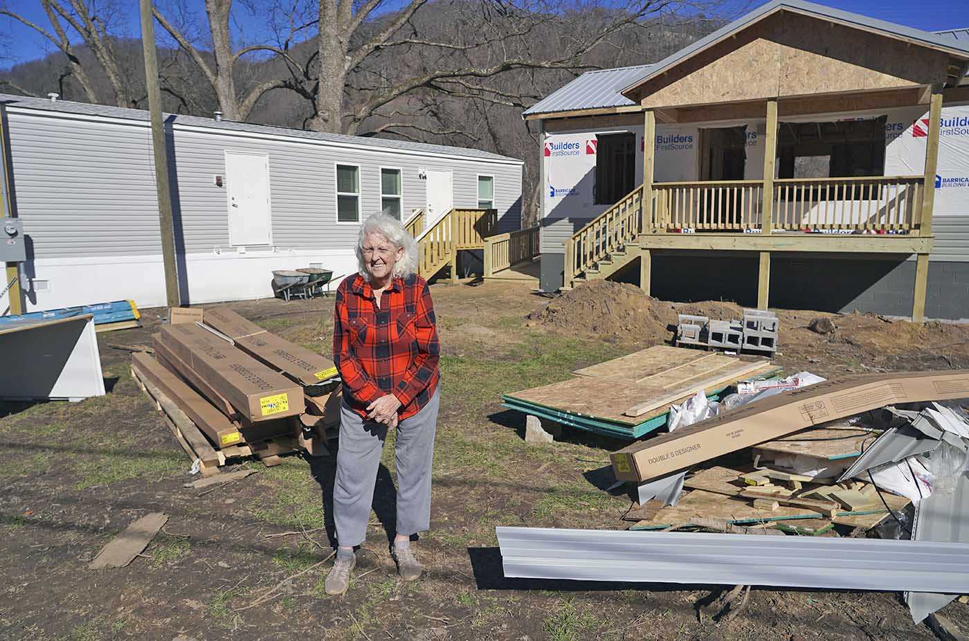 Betty Francis poses next to see her new home taking shape on her Jonesborough, Tennessee property next to the temporary home that FEMA provided after Tropical Storm Helene, March 2025. (FEMA Photo by Robert Kaufmann)