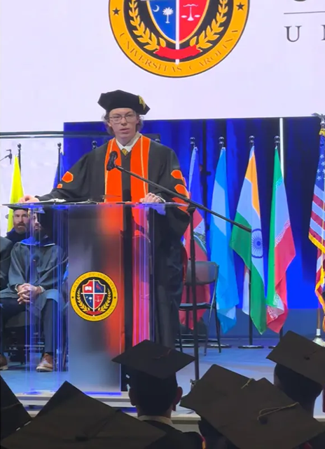 Mike Wimmer addressing his graduation class at Carolina University, May 3, 2025. Courtesy, Melissa Wimmer via The Epoch Times